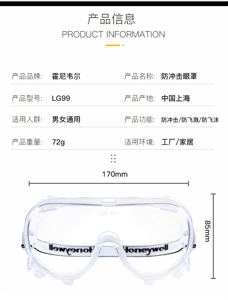 霍尼韦尔护目镜实验室劳保打磨防飞溅眼罩防尘防风镜防雾防护眼镜