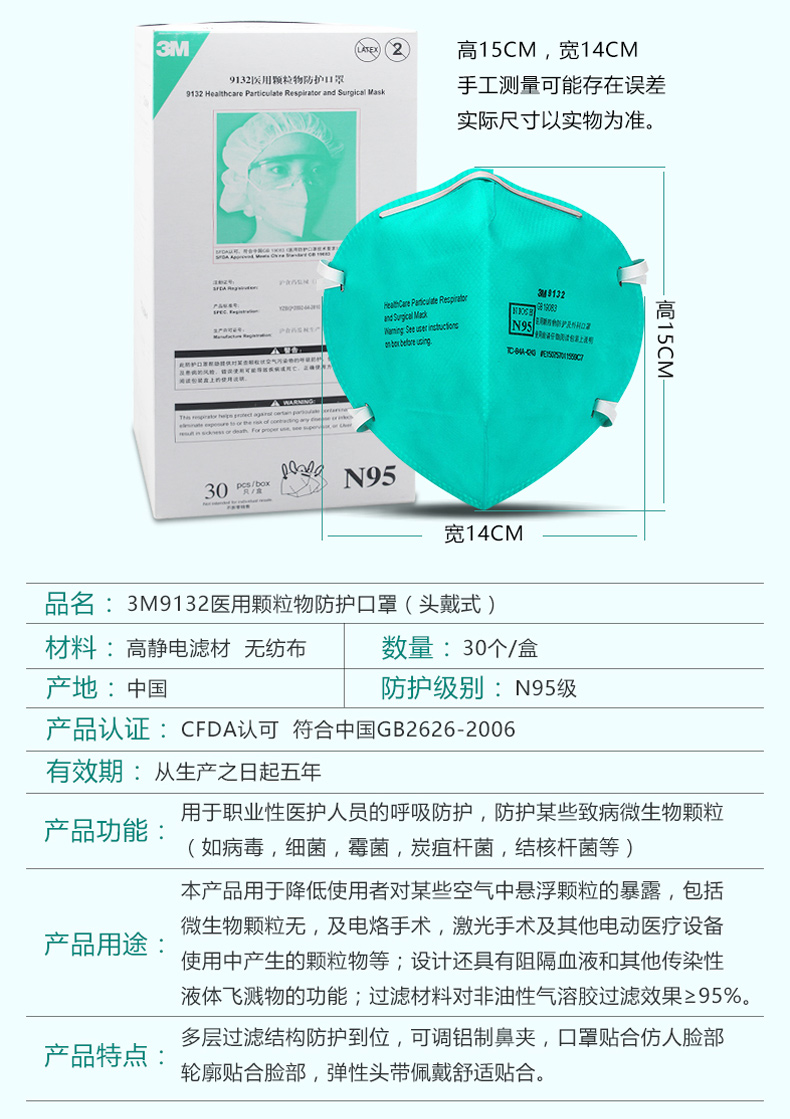 3M9132颗粒物防尘防护口罩防尘防飞沫口罩N95头戴式口罩独立包装